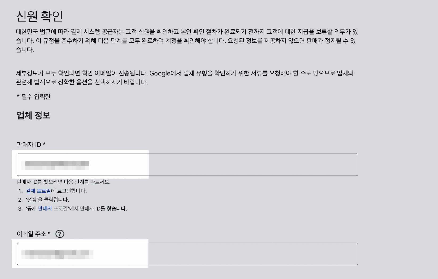 판매자 아이디는 구글 콘솔의 설정 > 결제 프로필 > 설정 > 공개 판매자 프로필에서 찾을 수 있고, 복사하여 입력합니다.