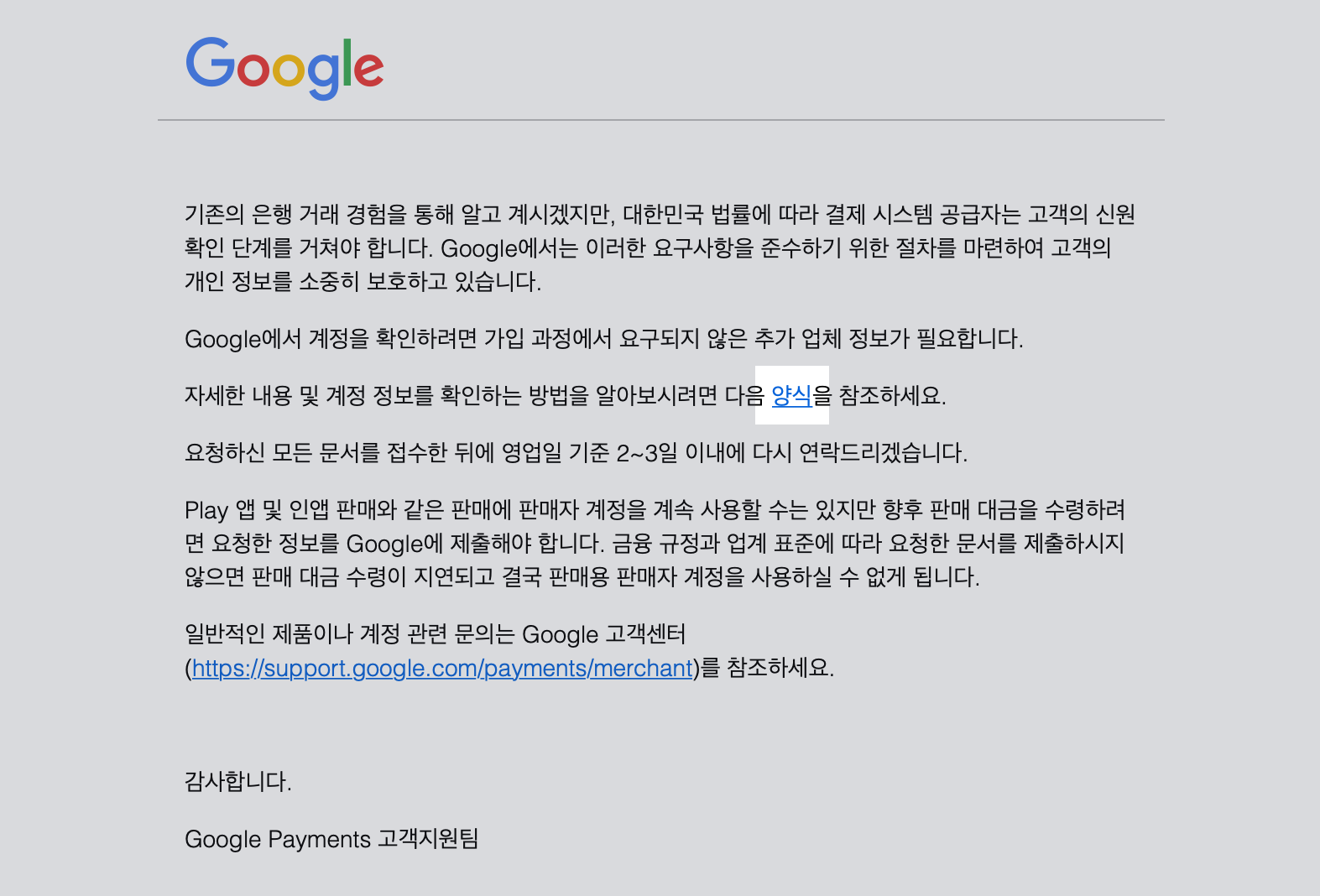 구글플레이콘솔에서 개발자 계정을 생성하고 앱 출시후 사용자의 첫 결제가 일어나면 결제 프로필의 신원확인을 위한 이메일이 도착합니다.