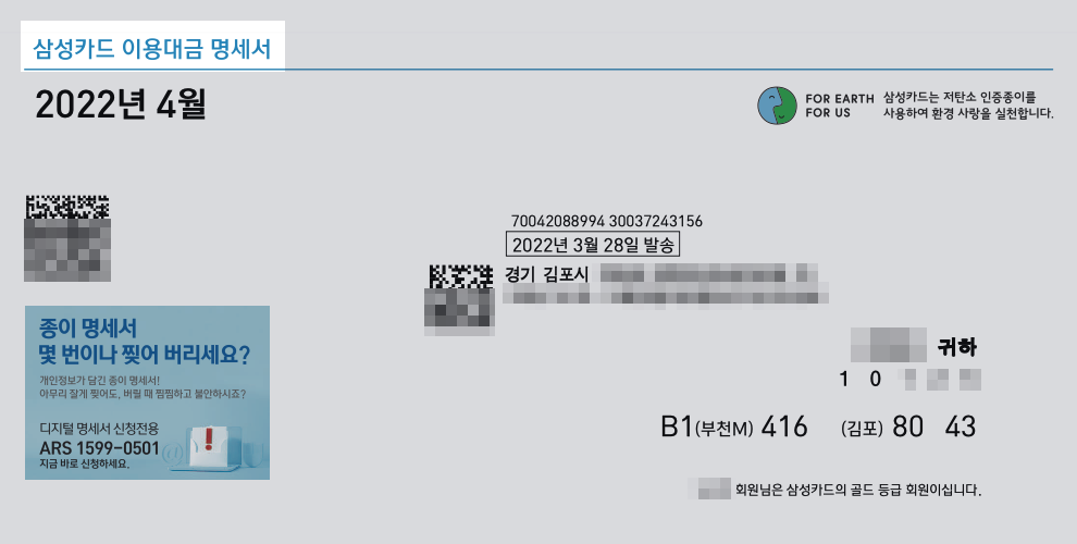 신용카드의 홈페이지에서 고지서를 조회하면 우편물로 발송되는 실물 명세서를 pdf파일로 조회해볼 수 있습니다.