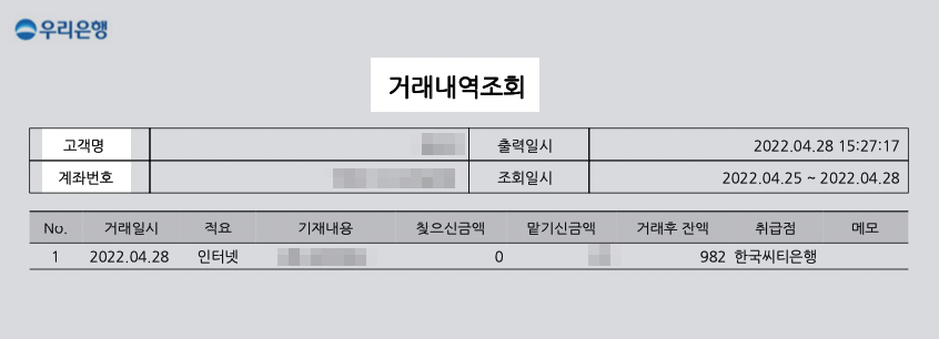 거래내역을 조회한 후 프린트 버튼을 누르면 일정한 양식의 문서로 pdf파일로 저장할 수도 있고, 프린터로 출력받을 수 있습니다.