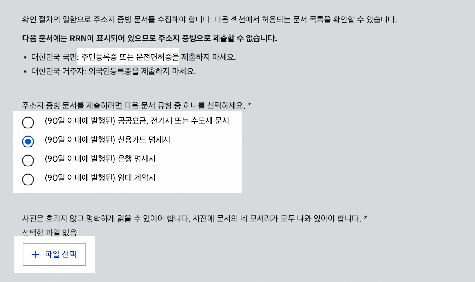 주소지 증명을 하기위해서 제출할 수 있는 파일유형이 네 가지입니다.