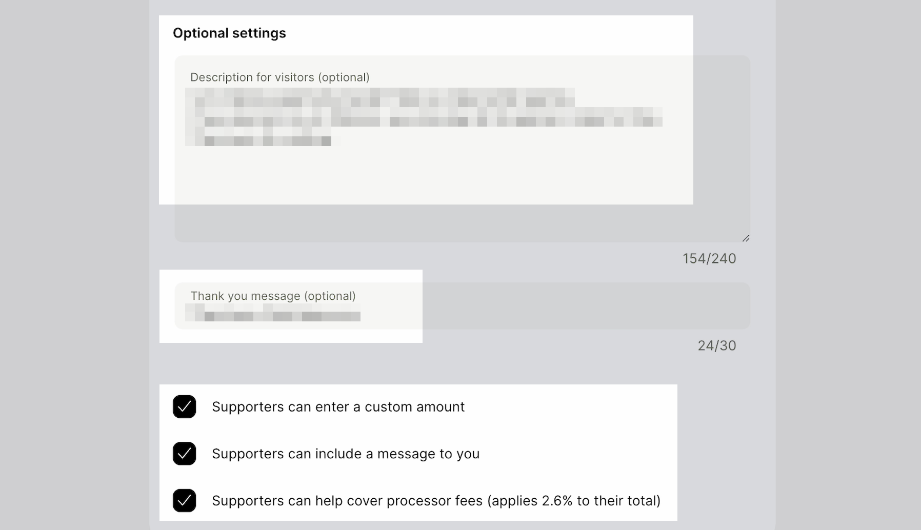 Description for visitors에 후원하려는 분들께 드릴 한 말씀을 입력하고, Thank you message에는 후원을 하고 난 분에게 드릴 감사인사를 작성합니다. 두 항목은 필수가 아니며 작성하지 않아도 되지만, 고마운 분들께 한 말씀 드리는 것이 좋겠습니다.
