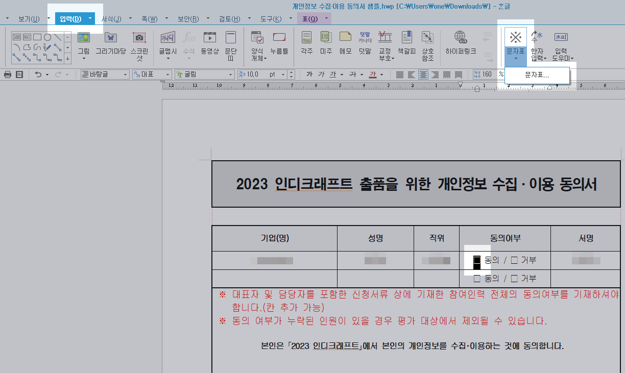 한컴오피스의 한글 문서로 제출해야할 문서에 체크박스가 있을 때, 출력해서 펜으로 표시할 필요없이 체크 표시가 되어 있는 체크 박스 특수기호 문자를 삽입하여 표시할 수 있습니다.